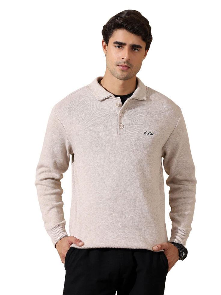 Kvetoo Men’s Wool Polo Collar Neck Winter Sweater Full Sleeve Solid Pullover fo