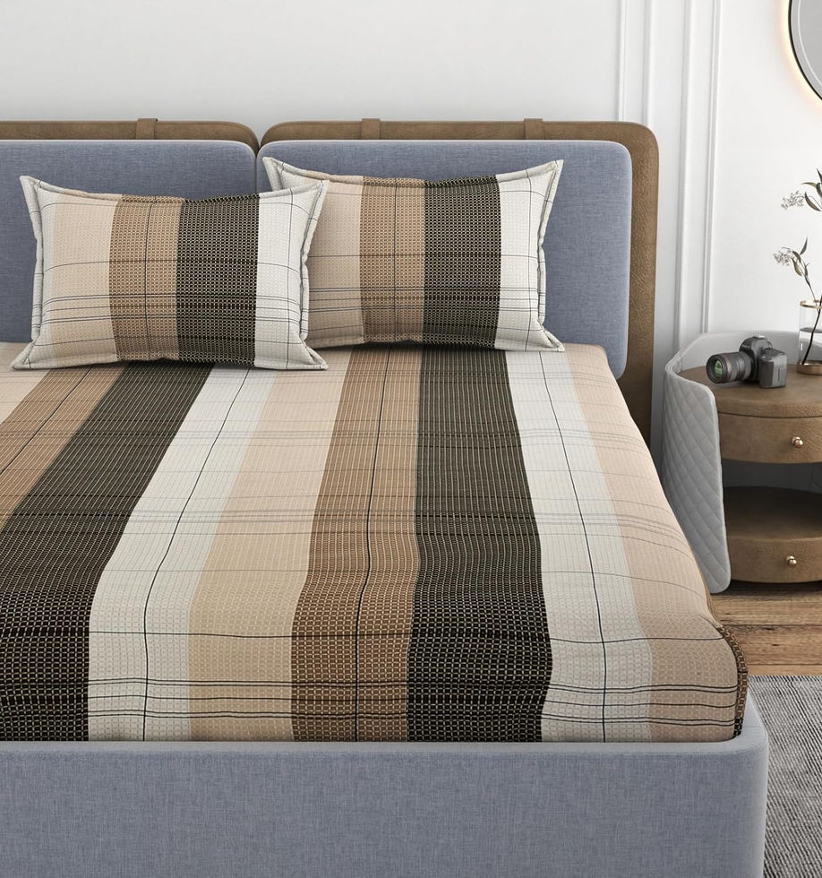 DIMENSIONS & CONTENTS: - One Elastic Fitted King Size Bedsheet with 2 Standard Size Pillow Covers.1 Double King Size Elastic Fitted Bedsheets Fits for 78 x 72 x 10 inches / 198 x 182 Cms / 6½ x 6 feet, Fits up to mattress thickness of 8 to 10 inch. Pillow Cover Size: Standard size 28 x 18 Inches. This fitted bedsheet is perfect for use in a home, hotel or ideal for any bedroom style.